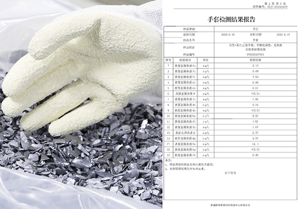 手套經過特殊工藝處理,通過驗證將手套放置氮氣柜當中80H,手套接觸產品無任何氧化情況,經權威機構檢測氯元素及硫元素完全符合接觸電池片標準,且不會在電池片上面留下任何指印。